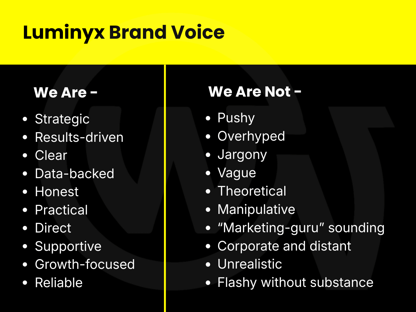 - Voice description with “we are / we are not” statements and 2 to 3 example sentences